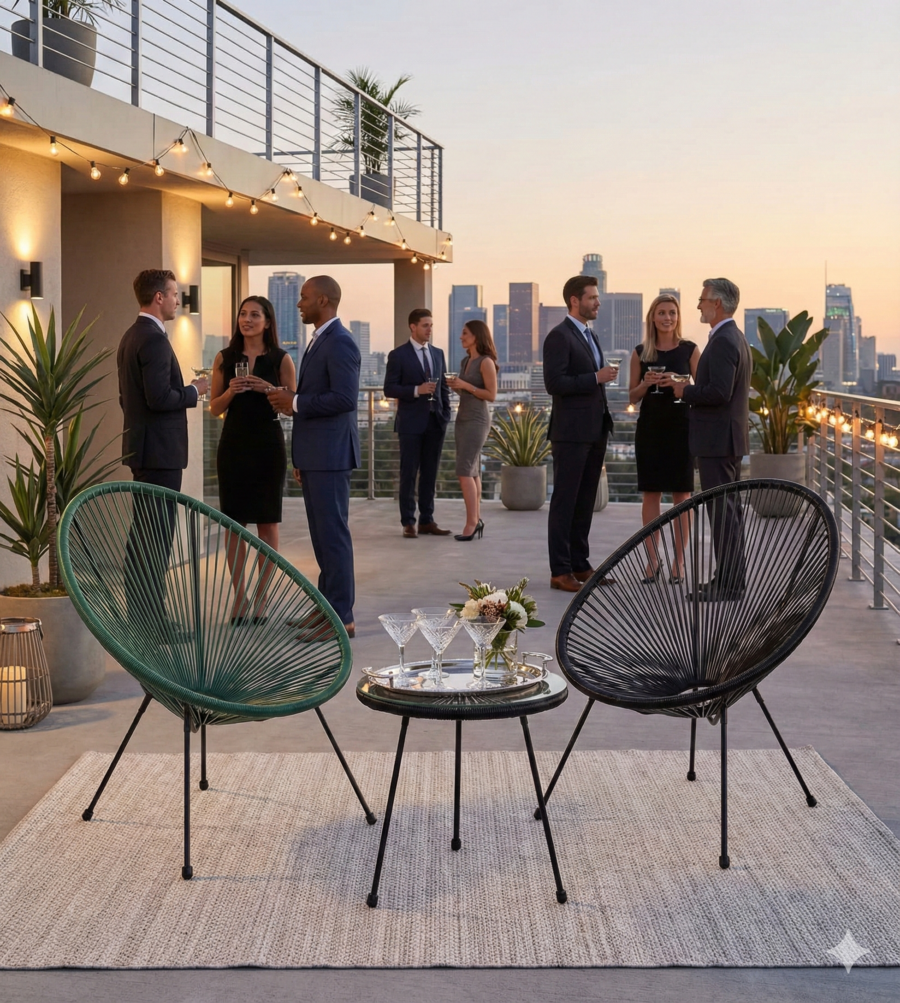 Durch die Glasplatte oder das dichte Geflecht wirkt der Tisch stabil und dennoch luftig. Das tiefe Schwarz verleiht ihm eine maskuline, moderne Note, die besonders gut in Business-Lounges, auf Messeständen oder minimalistischen Hochzeiten zur Geltung kommt.